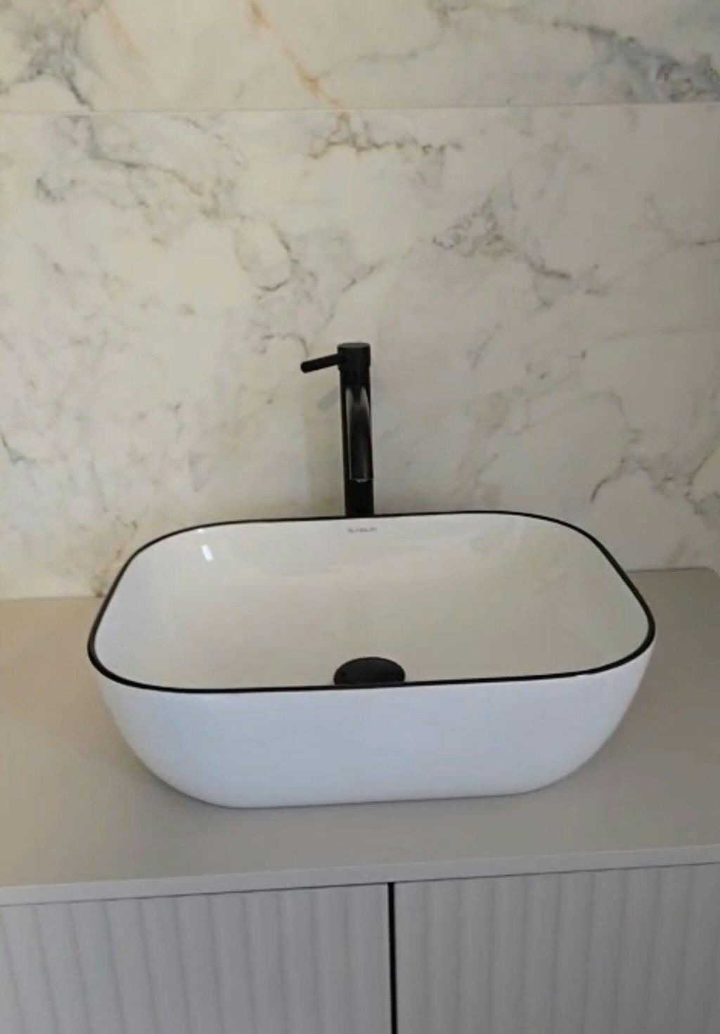 Forma dreptunghiulară cu colțuri rotunjite conferă un echilibru între minimalism și rafinament, oferind un aspect modern, dar și prietenos. Finisajul alb cu accent negru adaugă un plus de lux și sofisticare, fiind ideal pentru băile contemporane și elegante.